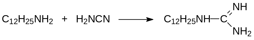 Ещё один фунгицид с основной группой и гидрофобным структурным элементом – ацетат додецилгуанидина (Додин) – характеризуется системной активностью с защитным и искореняющим действием. Это сильное основание получают по реакции додециламина с цианамидом: