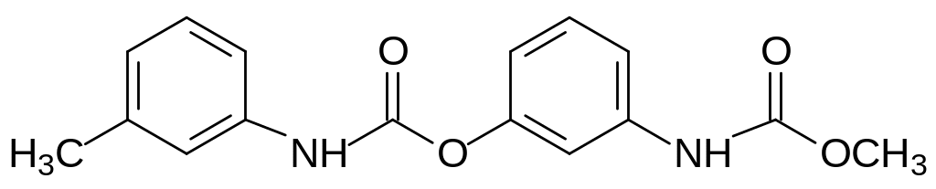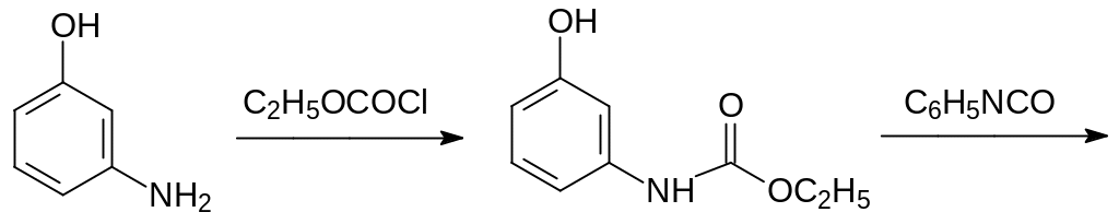 По аналогичной схеме из м-аминофенола и метилхлорформиата с последующей реакцией образовавшегося карбамата с м-толилизоцианатом получают фенмедифам: