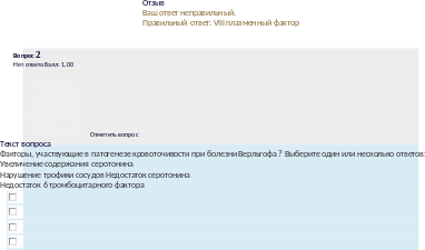 Отзыв Вашответнеправильный. Правильныеответы:Недостаток6тромбоцитарногофактора,Недостатоксеротонина,Нарушениетрофики сосудов |