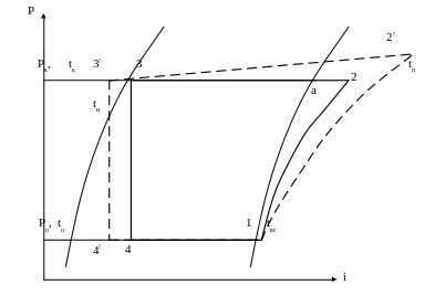 - падение давления в конденсаторе и испарителе вследствие трения х/а о стенки труб, в результате чего процесс сжатия между точками 1! и 2! требует большей затраты работы, чем в теоретическом цикле;