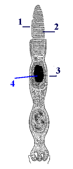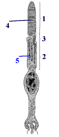 Части палочки 1. а) Как уже отмечалось, в периферическом отделе (дендрите, или палочке) палочкового нейрона различают 2 части: наружный (1) и внутренний (2) сегменты. б) Между ними находится узкий связующий отдел (3), часто называемый ресничкой. 2. Фоторецепция осуществляется наружным сегментом. |