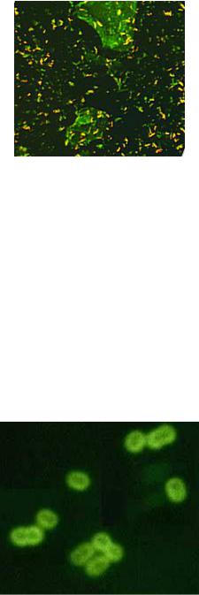 В последние годы широко используется иммунолюминесцентная микроскопия – реакция иммунофлюоресценции (РИФ) с применением специфических иммуноглобулинов, меченых флюорохромами. В качестве метки чаще всего используют флуоросцеина изотиоцианат (ФИТЦ). Комплекс “антитело + ФИТЦ” позволяет выявлять в РИФ очень низкие концентрации микробных клеток (рисунок 77).
