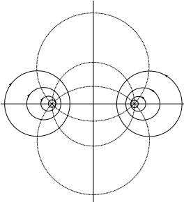 Сравнивая выражения для комплексного потенциала электростатического поля в системе двух заряженных тонких проводников и комплексного потенциала магнитного пол, двух тонких проводов вне этих проводов с постоянными токами, следует отметить их полное соответствие. Разница заключается лишь в том, что линии равного электрического потенциала электрического поля, являющиеся окружностями с центрами на оси абсцисс, в магнитном поле становятся линиями напряжённости магнитного поля, и, наоборот, линии напряжённости электрического поля, являющиеся окружностями с центрами на оси ординат, в магнитном поле становятся линиями равного магнитного потенциала.
