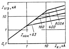 Быстродействующие предохранители для защиты полупроводниковых приборов ПП-41, ПП-57, ПП-71, ПП-59 выполняются с плавкими вставками из серебряной фольги в закрытых патронах с засыпкой кварцевым песком. Они рассчитаны на установку в Цепях переменного тока напряжением 3801250 В и постоянного тока 230-1050 В; номинальные токи 100-2000 А, предельные токи отключения До 200 кА. Эти предохранители обладают заметным токоограничивающим Действием. Зависимость ограниченного тока Iогр в сети напряжением 660 В от расчетного тока КЗ Iк. при разных номиналь-