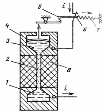 В рассмотренных выше предохранителях необходима замена плавкой вставки (плавкого элемента) после ее перегорания, что усложняет эксплуатацию. Таким недостатком не обладают жидкометаллические предохранители, которые разрабатываются в последние годы. В изоляционной трубке 8 (рис. 2.7) канал 2 малого диаметра, заполненный жидким металлом (галлий, сплав Gа - In, Sn и др.) из резервуаров 1 и 3, играет роль плавкой вставки. При токе КЗ столбик металла в канале 2 взрывается и дуга в нем гаснет. Возникающее давление действует на мембрану 4, которая воздействует на защелку 5 и расцепляет ее. Пружиной 7 размыкаются контакты 6, обеспечивая разрыв цепи. Металл заполняет канал 2, и предохранитель вновь готов к работе. Для включения его в цепь необходимо вручную или приводом дистанционно включить контакт 6.