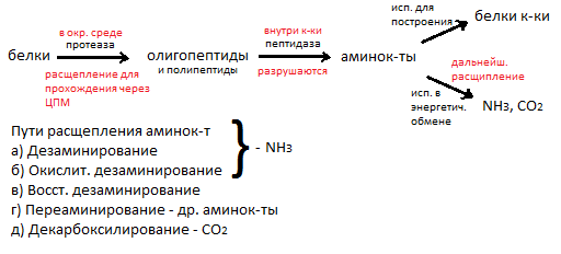 Образовавшиеся при распаде белка аминок-ты идут на синтез белков к0-ки или подвергаются дальнейшему расщеплению. Аминок-ты, поступая в к-ку, дезаминируются с образованием аммиака (NH3), орг. к-т и др. продуктов.