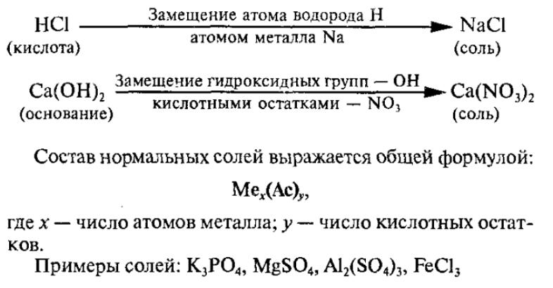 Соли –это сложные вещества, являющиеся продуктами замещения атомов водорода атомами металла в молекулах кислот или продуктами замещения гидроксидных групп в молекулах оснований кислотными остатками.