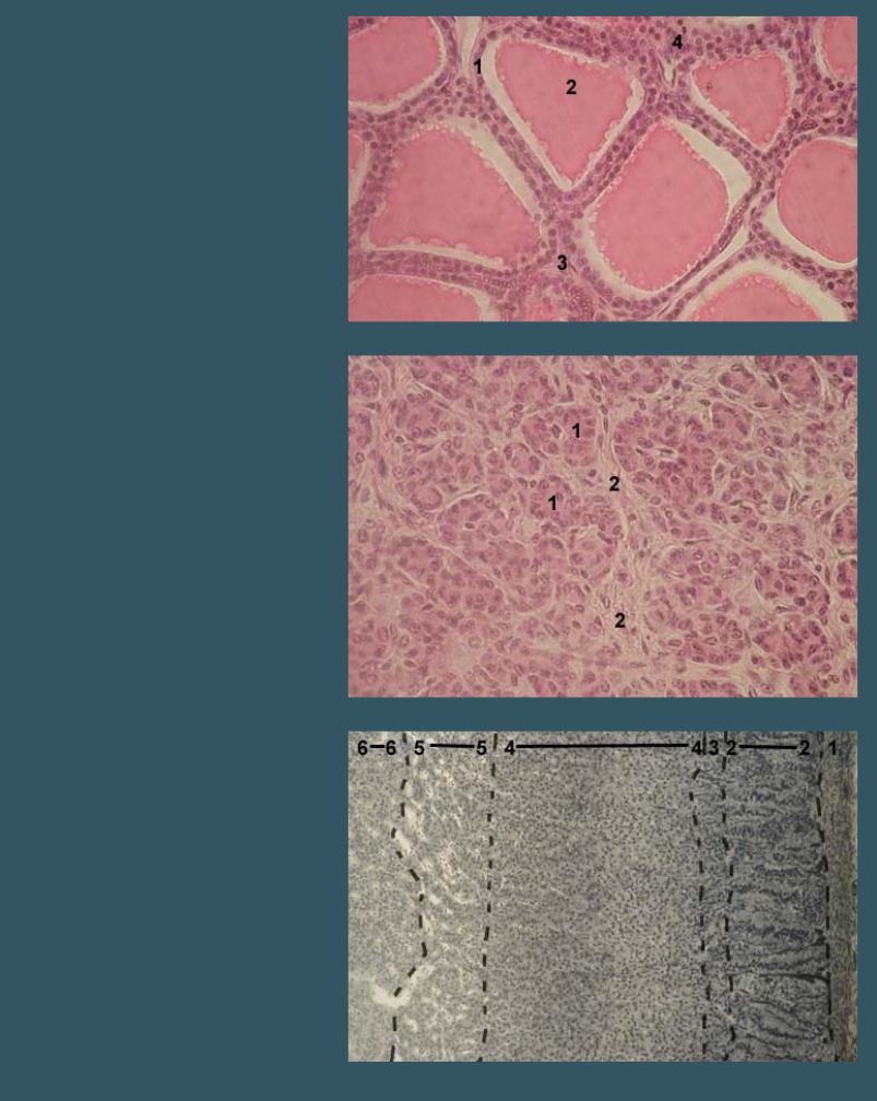 1 - стенка фолликула, образованная тироцитами 2 - полость фолликула, заполненная коллоидом