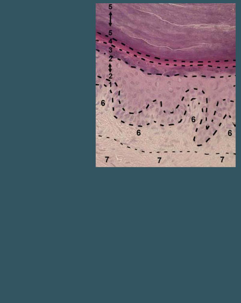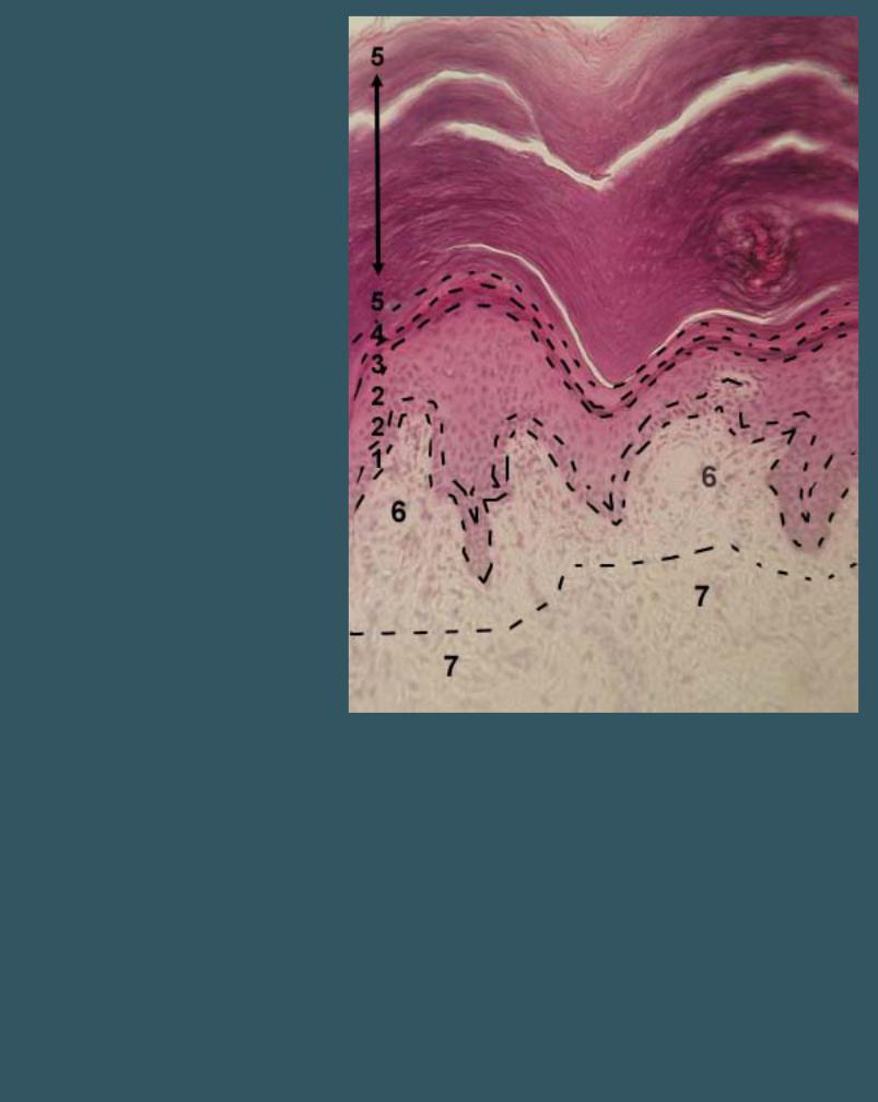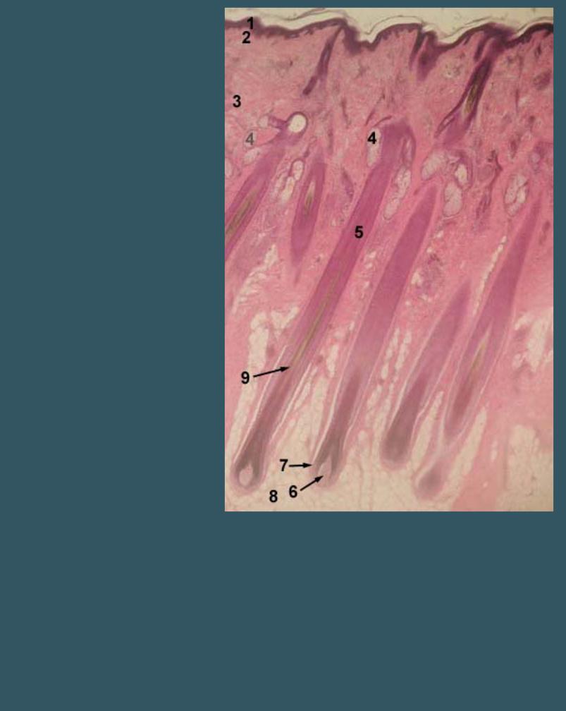 3 - внутреннее эпителиальное корневое влагалище 4 - наружное эпителиальное корневое влагалище 5 - корень волоса 6 - волосяная сумка