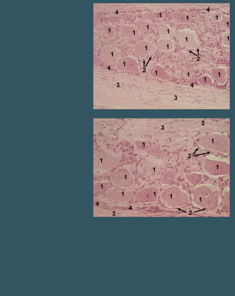 1 - тела нейронов (псевдоуниполярные нейроны) 2 - клетки-сателлиты 3 - нервные волокна