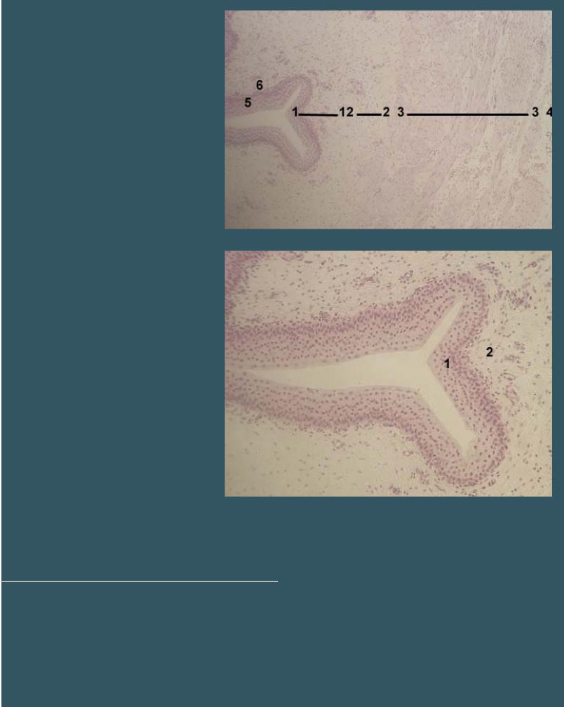 5 - эпителий (переходный) слизистой оболочки 6 - собственная пластинка слизистой оболочки