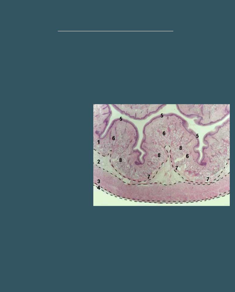 6 - собственная пластинка слизистой оболочки 7 - мышечная пластинка слизистой оболочки
