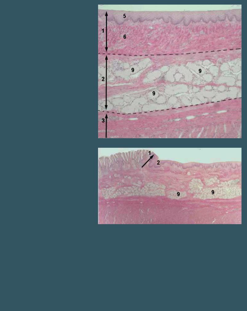 6 - собственная пластинка слизистой оболочки 9 - железы подслизистой оболочки