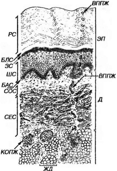 Рис. 4-1 Толстая кожа. ЭП - эпидермис. БАС - базальный слой, ШС - шиповатый слой, ЗС - зернистый слой, БЛС - блестящий слой, PC - роговой слой, Д - дерма. СОС - сосочковый слой. СЕС - сетчатый слой. ПЖК - подкожная жировая клетчатка: ЖД - жировые дольки, КОПЖ - концевые отделы потовых желез, ВППЖ - выводные протоки потовых желез.