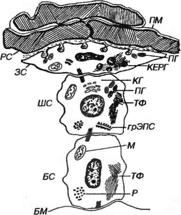 Рис. 4-2. Дифференцировав кератиноцитов (схема) БМ - базальная мембрана, БС - базальный слой, ШС - шиповатый слой, ЗС - зернистый слой, РС - роговой слой, Р - рибосомы, ТФ - тонофиламенты, М - митохондрии, грЭПС - гранулярная эндоплазматическая сеть, ПГ - пластинчатые гранулы, КГ - комплекс Гольджи, КЕРГ -кератогиалиновые гранулы, ПМ - плазмолемма (по Россу и соавт., с изменениями)