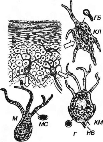 Рис. 4-3. Отростчатые клетки эпидермиса. М – меланоцит, МС - меланосома, КЛ - клетка Лангерганса, ГБ - гранулы Бирбека, КМ - клетка Меркеля, Г - гранулы, НВ - нервное волокно.