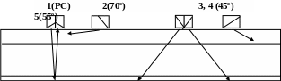 Преобразователь с углом ввода 55, акустическая ось которого направлена в сторону, противоположную движению дефектоскопа и развернута под углом 34 относительно продольной оси рельса, предназначен для выявления эхо-методом вертикальных поперечных трещин в рабочей грани головки рельса (рисунок 3).