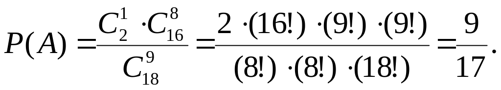 18 футбольных команд, среди которых 2 сильнейшие, произвольно разбиваются на 2 подгруппы по 9 команд в каждой. Найти вероятность того, что 1) в каждой подгруппе будет по одной сильнейшей команде (событие ) 2) две сильнейшие команды попадут в одну подгруппу (событие ).