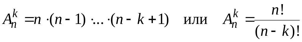Пусть имеется множество из элементов. Каждое его упорядоченное подмножество из элементов называется размещением из элементов по . Итак, размещения – это подмножества из элементов, отличающиеся друг от друга либо элементами, либо порядком элементов. Число размещений находится по формуле