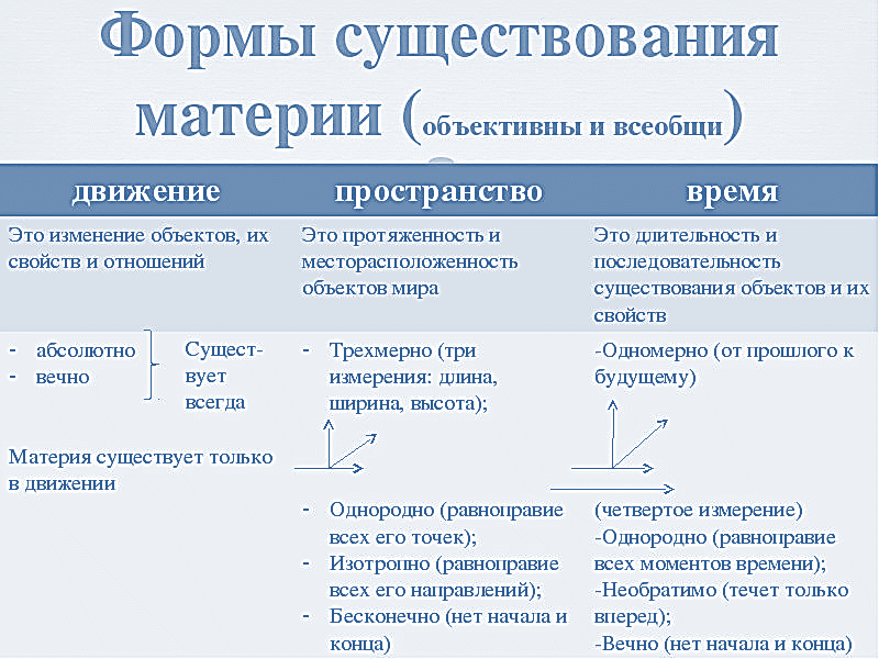 Время характеризует материальное бытие как вечное и неуничтожимое в своей совокупности. Время одномерно (от настоящего к будущему), ассиметрично и необратимо.