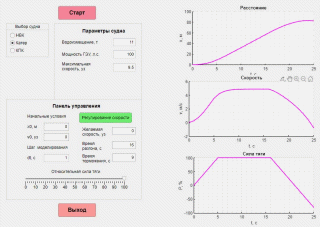 В данном приложении также присутствует возможность регулировать скорость судна. Данный режим становится доступным после нажатия пользователем клавиши «Регулирование скорости» на панели управления. Пока клавиша остается нажатой программа находится в режиме регулирования скорости. В данном режиме пользователю предлагается ввести необходимое значение скорости, которую должен развивать корабль и время разгона. Также при желании можно задать начальные значения и время торможения. Так как в режиме регулирования скорости относительная сила тяги не может изменяться пользователем, то ползунок для ее изменения становится невидимым. После нажатия кнопки «Старт» строятся зависимости, полученные в результате моделирования.