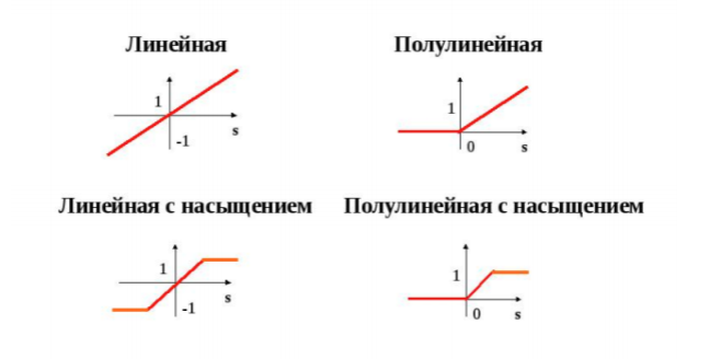 Линейная, полулинейная, линейная с насыщением, полулинейная с насыщением, треугольная и радиальная функции активации.