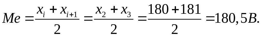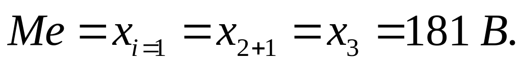 Пример 3. Возьмём из табл. 2.3 пять первых значений пробивного напряжения (х1=179, х2=180, х3=181, х4=182, х5=183),т.е. нечётное число измерений, расположенных в возрастающем порядке. Находим медиану: (2i+1)=5, откуда 2i=4, i=2. По формуле (2.5) получим