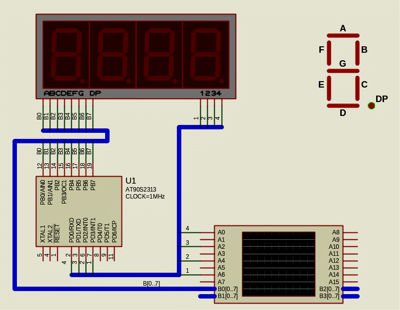 3.1. В программе ISIS составить схему устройства с динамической индикацией на микроконтроллере из семейства AVR Attiny. Для последующего моделирования устройства предусмотреть подключение виртуального логического анализатора.