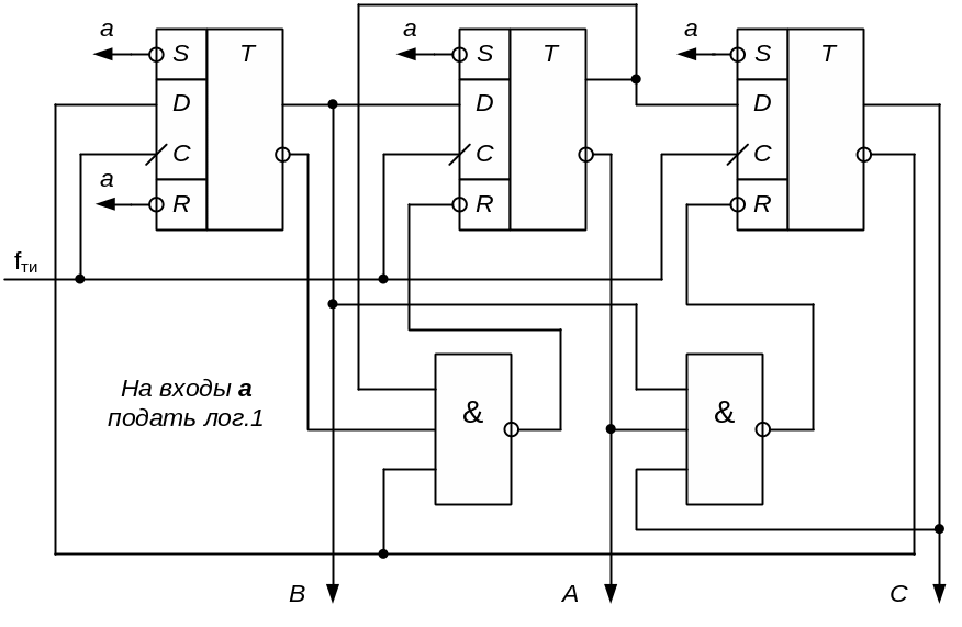 Нетрудно установить, что в обоих схемах триггеры образуют цепочку в виде регистра сдвига, охваченного инвертирующей обратной связью, и дополненную логическими узлами для вывода из ложных циклов. Отсюда естественно использовать для организации КК регистр сдвига в виде интегральной схемы, например, К555ИР8. Ее следует дополнить элементами для инвертирующей связи третьего выхода со входом и для получения неинвертированного сигнала В или С. Ввиду неопределенного состояния регистра при подаче питания и возможности сбоев во время работы следует предусмотреть логику вывода из ложных циклов, аналогичную приведенным выше.