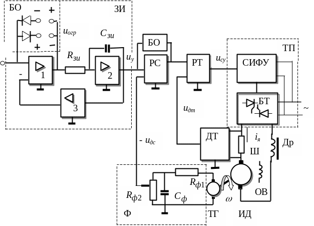 переменного тока со сглаживающим фильтром (Ф) и управляющую часть в виде регулятора скорости (РС) и регулятора тока (РТ).