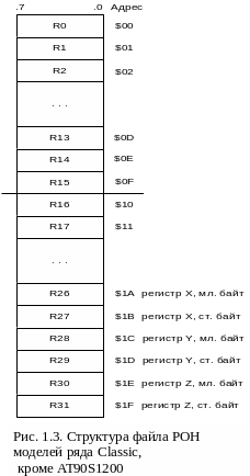 Все регистры общего назначения объединены в файл, структура которого показана на рис. 1.3. Как уже было сказано, в микроконтроллерах AVR все 32 РОН непосредственно доступны АЛУ в отличие от микроконтроллеров других фирм, в которых имеется только один такой регистр – рабочий регистр А или W (аккумулятор). Благодаря этому любой РОН может использоваться во всех командах и как операнд-источник и как операнд-приемник. Следует учесть, что команды, выполняющие действия с константой, могут обращаться только ко второй половине регистров (R16...R31). Кроме того, непосредственная пересылка констант в порты и другие регистры устройств невозможна и выполняется через какой-либо РОН. Обычно в качестве такого «аккумулятора» используют R16, поэтому пользоваться им для других целей не следует 1.