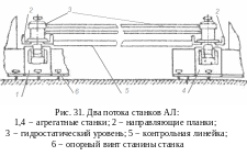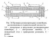 Контрольной линейкой 2 (рисунок 34), установленной на ролики всех поворотных столов 1 и 6, проверить правильность расположения наружных поверхностей роликов в одной плоскости (допустимое отклонение обычно составляет ±0,2 мм). При отклонениях сверхдопустимых, уточнить выставление оборудования.