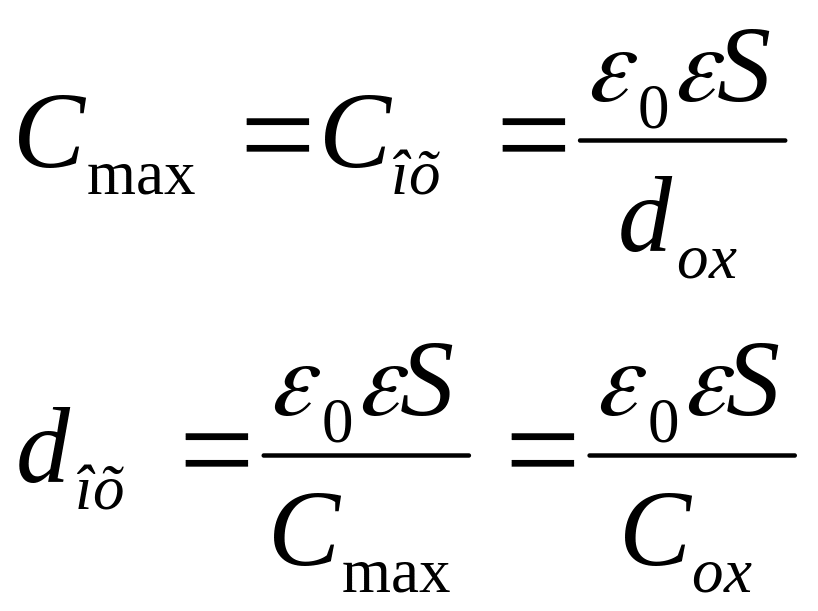 где Сох - емкость диэлектрика; dох - толщина диэлектрика; S - площадь МОП - структуры, S = 1 мм2 = 10-2 см2=10-6м2; - диэлектрическая проницаемость диэлектрика SiO2, = 3,8; диэлектрическая проницаемость вакуума, o = 8,85 10-12 Ф/м.