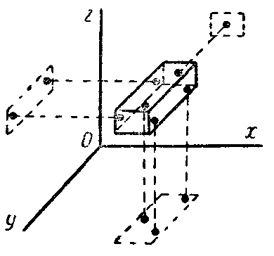 Схема базирования призматических деталей. Эта схема предусматривает базирование заготовок деталей типа плит, крышек, картеров и др. Каждая обрабатываемая заготовка призматической формы, если ее рассматривать в системе трех взаимно перпендикулярных осей (рис. 2.1), имеет шесть степеней свободы: три перемещения вдоль осей Ох, Оу, Оz и три перемещения при повороте относительно этих же осей. Положение заготовки в пространстве определяется шестью координатами (рис. 2.1, пунктирные линии).