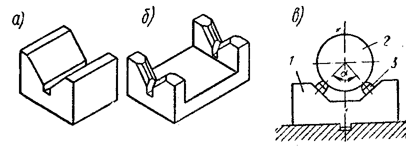 Длинные валы, особенно при обработке на фрезерных станках (фрезерование шпоночных канавок, плоскостей) базируются по наружным цилиндрическим поверхностям, которые устанавливают в призмы. Для чисто обработанных баз применяют широкие призмы (рис 2.3, а), для черновых — узкие (рис. 2.3, б); на рис. 2.3, в показан способ установки заготовки 2 на четыре постоянные опоры 3, запрессованные в боковые поверхности призмы 1.