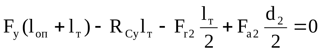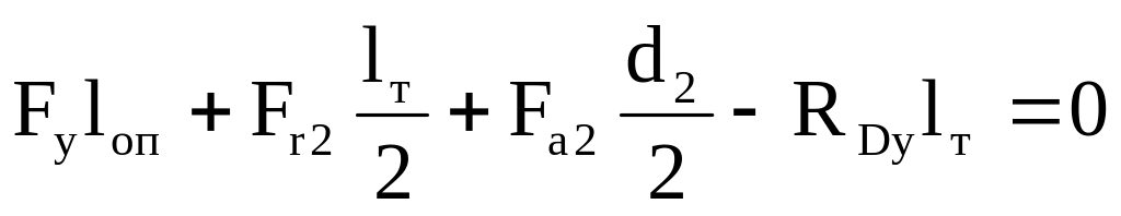 Дано: Ft2 = 4000 Н; Fr2 = 1480 Н; Fa2 = 860 Н; Fоп = 5200 Н; Fу = Fоп sin30° = 2600 Н; Fх = Fоп cos30° = 4500 Н; d2 = 0.18 м; lт = 0.16 м; lоп = 0.06 м;