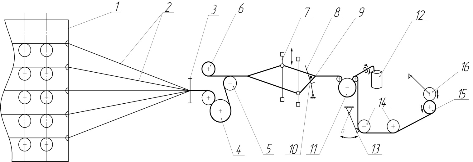 Углеродные нити (нити основы) 2, сматываемые с бобин на шпулярнике 1, проходят через концентрирующее бердо 3, огибают натяжной барабан товарного регулятора 4, скало 5 и принимают горизонтальное положение. Далее они проходят через глазки галев ремизок 7, перемещающих углеродные нити в вертикальном направлении для образования зева. В зев рапирой 10 вводится углеродная нить (уточная нить), которая прибивается к опушке ткани бердом 8, совершающим возвратно-поступательное движение. У опушки углеродной ткани нити основы, переплетаясь с нитью утка, образовывают углеродную ткань, которая огибает грудницу, вальян 11, направляющие валики 14 и наматывается на товарный вал 15. Для более плотного наматывания ткани на товарный вал в лабораторном комплексе получения прекурсоров применяется прижимной вал 16.