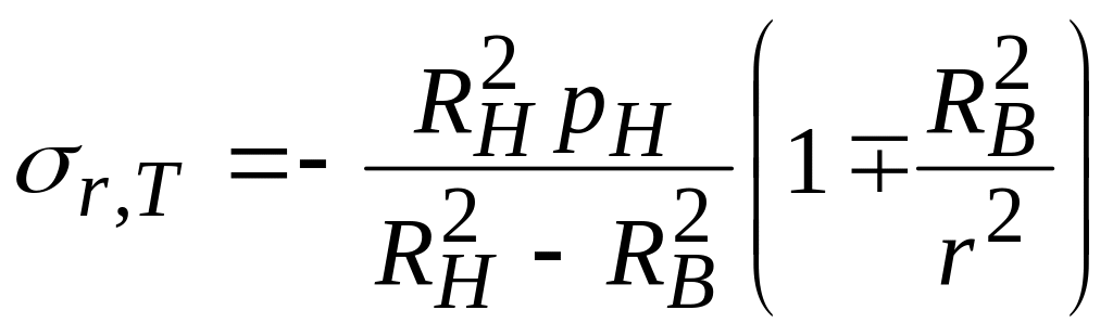 и окружные напряжения можно считать равномерно распределенными по толщине кольца. При большой толщине трубы напряжения r и T в точках, удаленных от внутренней поверхности, сближаются по величине и в пределе, при RH , становятся одинаковыми и противоположными по знаку.