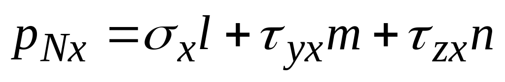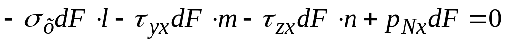 Составим уравнение равновесия тетраэдра, спроектировав все силы, действующие по его граням, на ось х; проекция объемной силы в уравнение проекций не входит, так как представляет собой величину высшего порядка малости по сравнению с проекциями поверхностных сил: