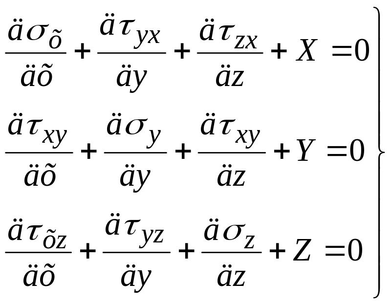 Составив аналогичные уравнения проекций сил на оси у и z, получим три дифференциальных уравнения равновесия элементарного параллелепипеда, выведенных Коши,