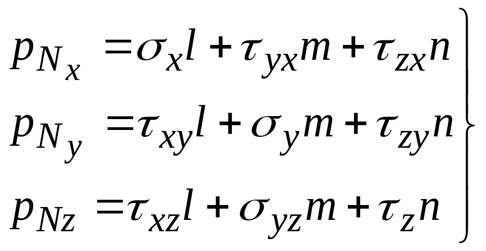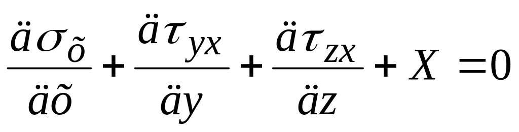 Составив уравнения проекции сил, действующих на тетраэдр, на оси у и z, получим еще два аналогичных уравнения. В результате будем иметь три уравнения равновесия элементарного тетраэдра