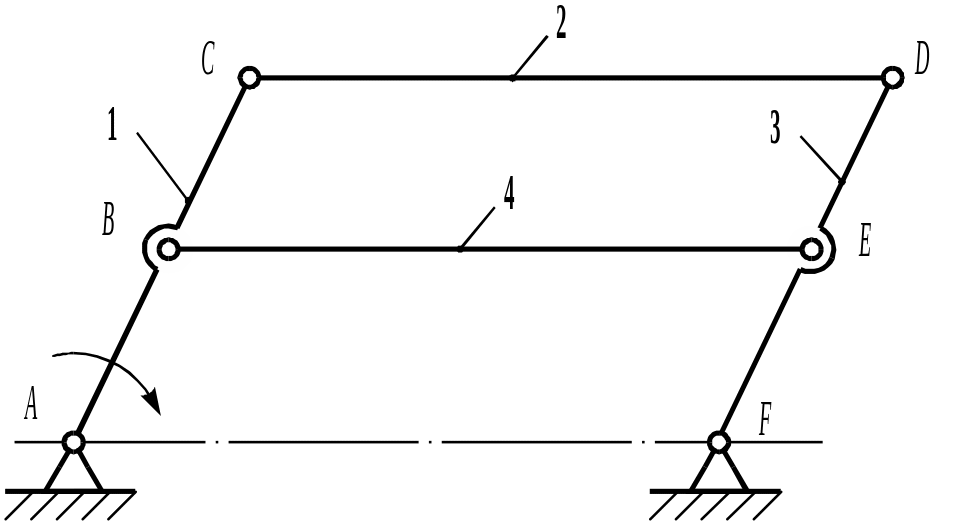 Звено BE создает избыточные связи, ставится оно в механизме, исходя из конструктивных соображений; если же его удалить характер движения остальных звеньев не изменится.
