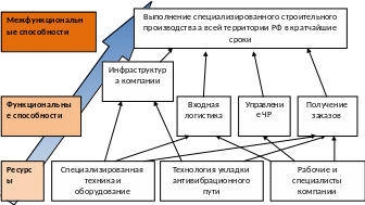 Как видно из представленной цепочки ценностей, ключевыми способностями компании для получения конкурентного преимущества являются: инфраструктура компании, управление человеческими ресурсами, способность к получению заказов, входная логистика и выстроенная цепочка операций по выполнению строительного производства «под ключ».