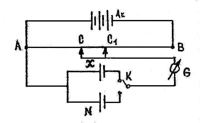 Аккумулятор замыкает реохорд AB. Если отрицательный электрод аккумулятора подключен к клемме A, то к ней же следует подключать и отрицательный электрод исследуемого элемента X: тогда ток от элемента будет направлен навстречу току аккумулятора. Положительный полюс элемента X через