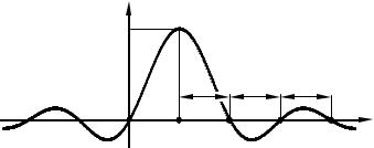 Таким образом, импульсная характеристика идеального ФНЧ описывается запаздывающей на время tЗ известной нам функцией «синк» и имеет вид, показанный на рис. 4.15. Заметим, что с учётом полученного аргумента функции «синк», описывающей импульсную характеристику идеального ФНЧ, половина длительности основного лепестка равна длительности первого, второго и последующих боковых лепестков и обратно пропорциональна частоте среза фильтра.