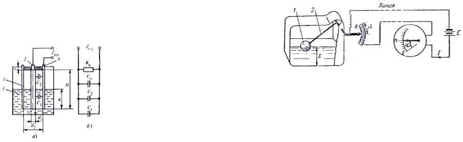 Конденсаторный преобразователь для неэлектропроводных жидкостей, состоящий из двух коаксиально расположенных электродов 1 и 2, помещенных в резервуар 3, в котором производится измерение уровня, изображен на рис. 11, а.