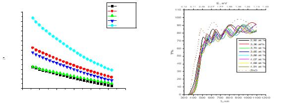 Рис.2 Спектры пропускания тонких пленок ZnOFe с разным содержанием Fe