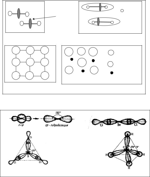 а) sp-гибридизация (линейная молекула BeCl2); б) sp2-гибридизация (треугольная молекула ВС13); в) sp3-гибридизация (тетраэдрическая молекула CН4)