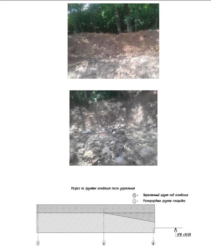 Впроцессе работы шел сильный дождь, но, тем не менее, порядка 1500 м3 грунта было укреплено. К тому же, данные погодные условия показали эффективность созданного основания с глиняной завесой (рис. 10) и цементацией грунтов с использованием б/у строительных материалов (рис. 11,12). Теперь стало очевидно, что основание не будет «замокаться» мокнуть.