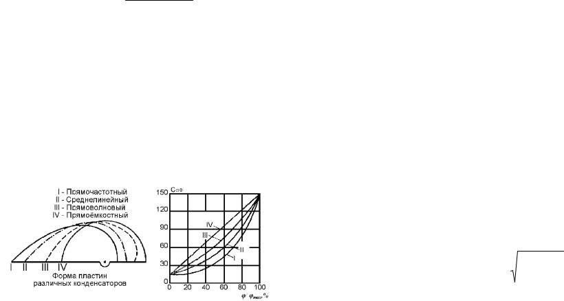 т. е. емкость должна убывать при увеличении угла поворота. Более привычны прямочастотные конденсаторы с так называемым «обратным вращением», у которых при увеличении угла поворота емкость возрастает, а частота контура убывает